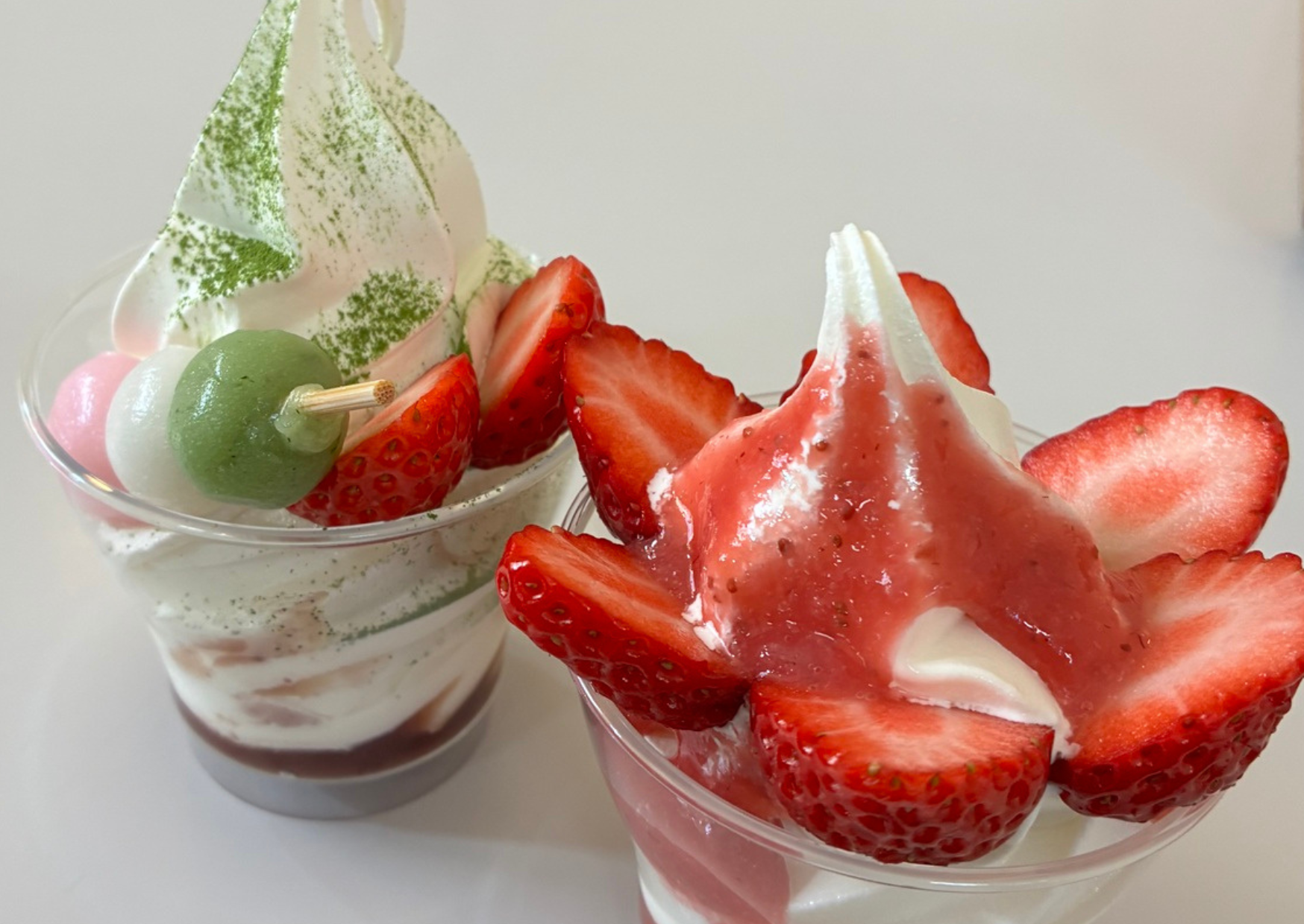 梅を見た後は、園内でソフトクリームのパフェを食べました。いちごのパフェと抹茶のパフェで、どちらもすごくおいしかったです。寒い日でしたが、つい食べてしまいました。