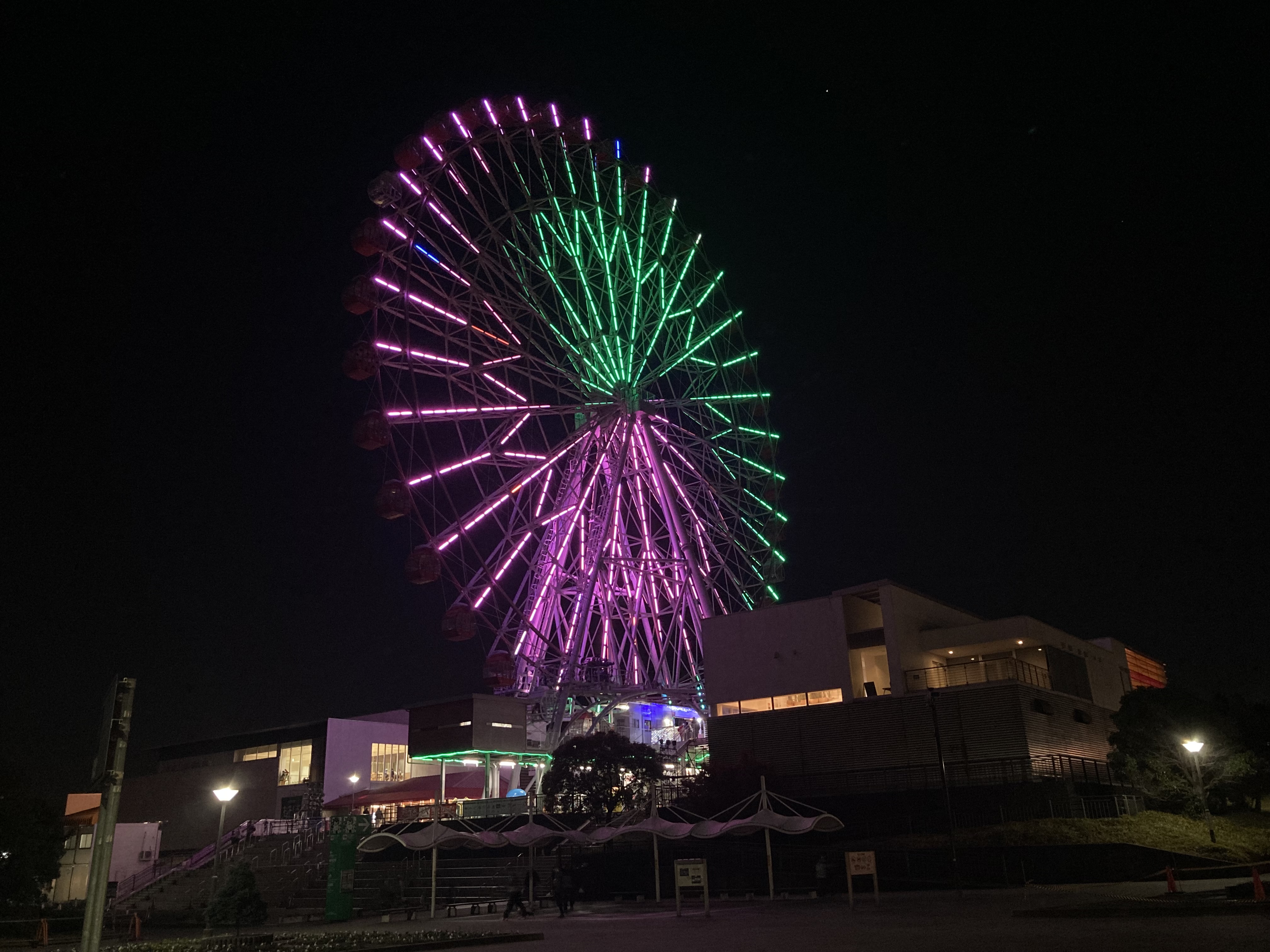 ランドマークになっている観覧車が7色のイルミネーションにライトアップされ綺麗でした。